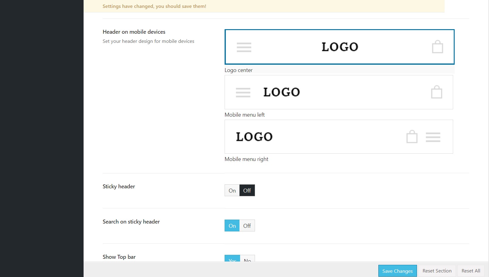 The header is probably one of the first things you will want to setup. It includes the logo, favicon, menu and other things. The following sections will explain how to set up and customize header.
